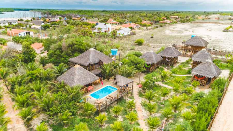 Bangalôs suspensos construídos com madeira rústica e cobertura da palha de carnaúba compondo um cenário aconchegante com camas confortáveis, chuveiro elétrico e a opção de ar condicionado. A pequena varanda com rede e mesa para leitura lhe proporcionará momentos de tranquilidade sentindo a brisa que vem do oceano.